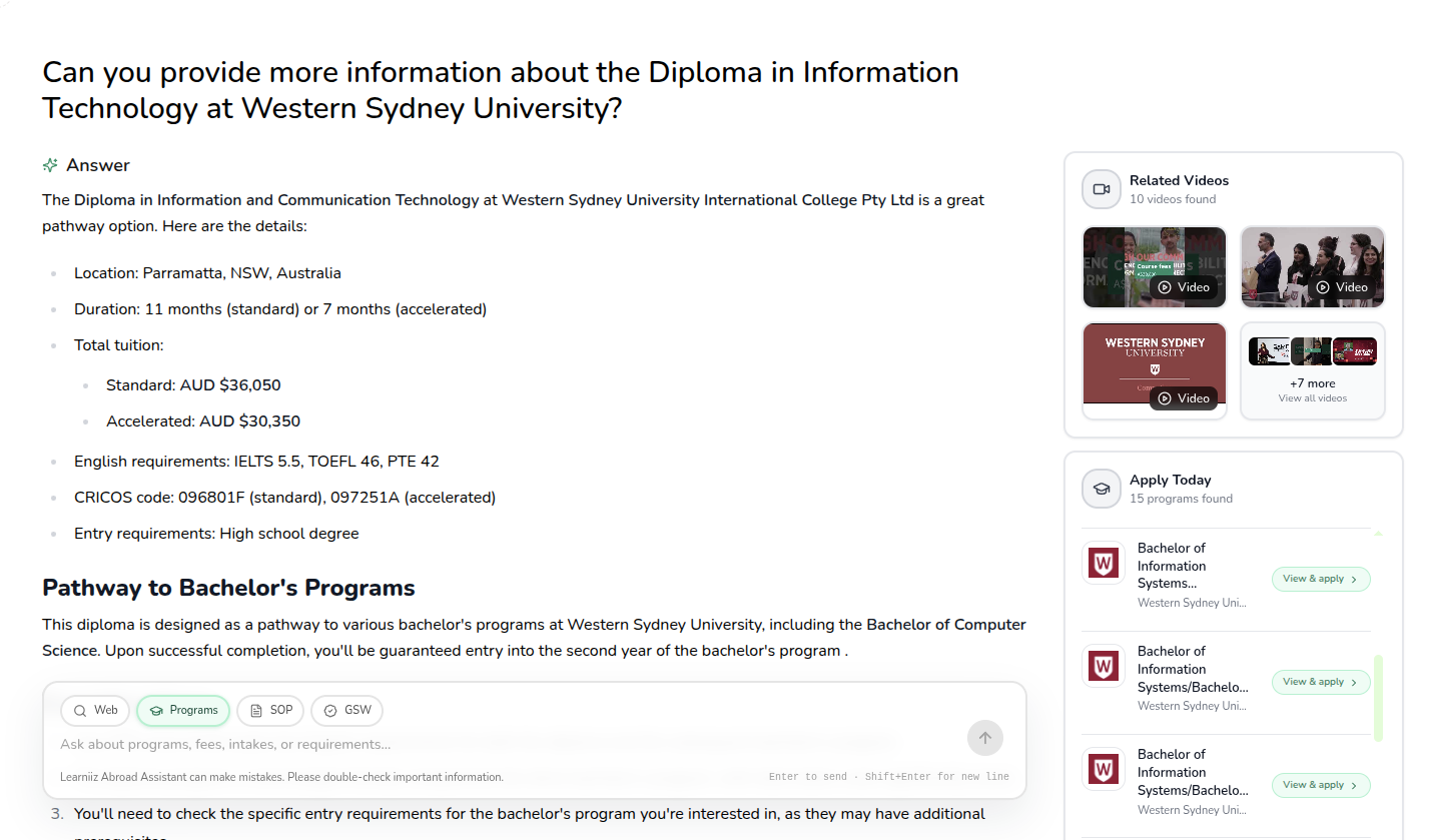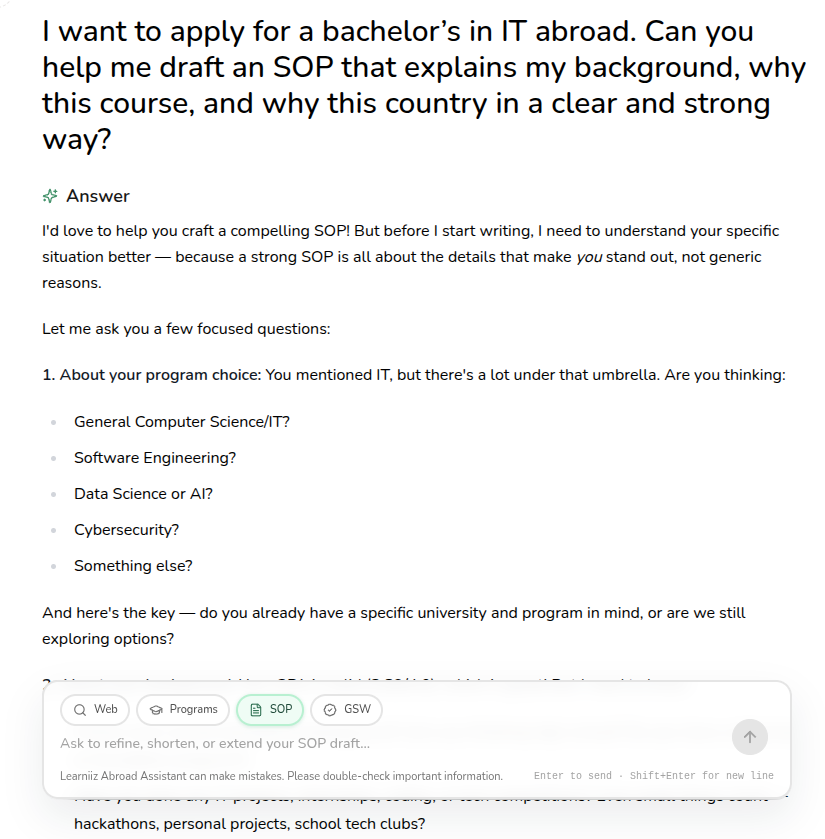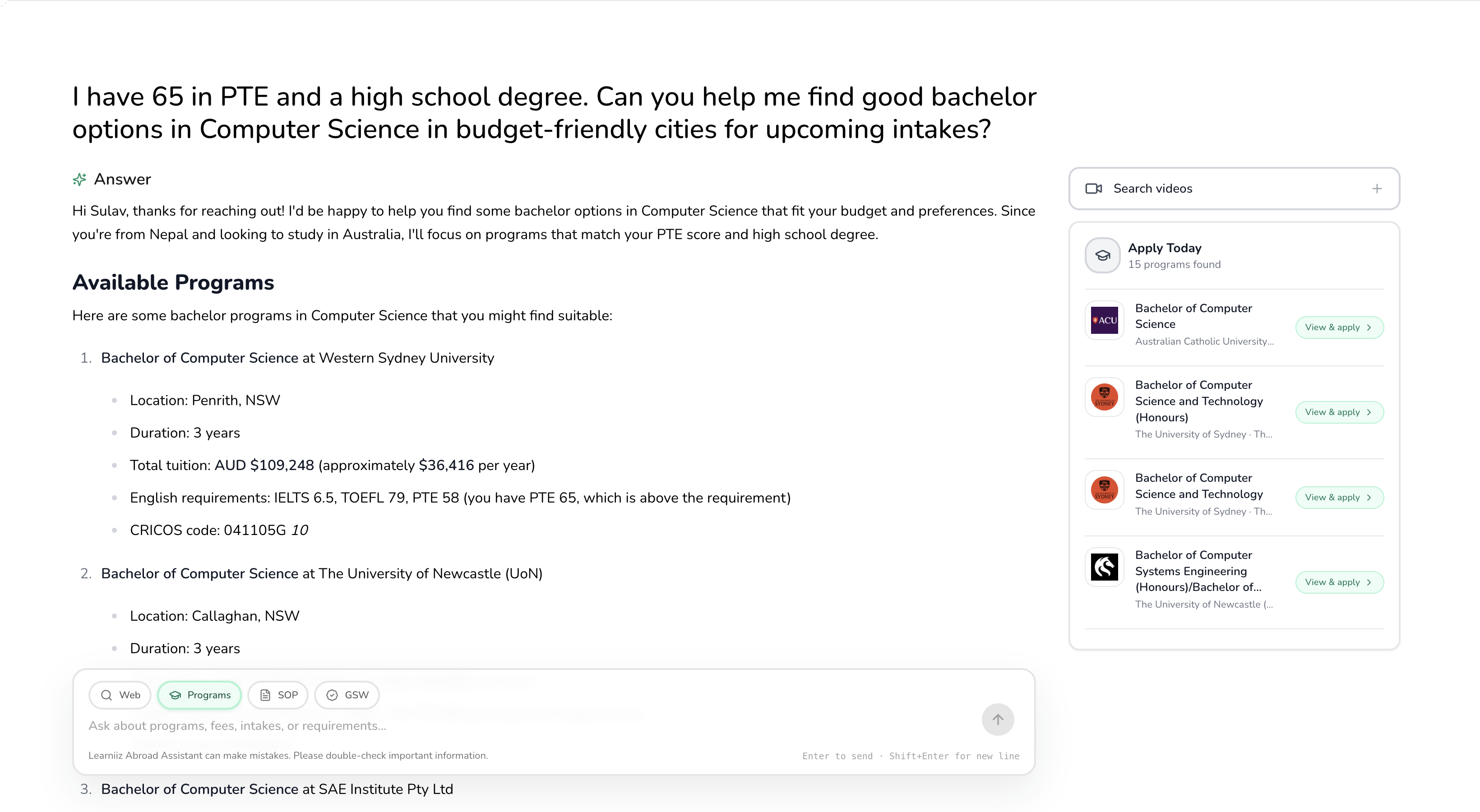 Your AI agent for everything abroad. Web search mode for research, program finder across institutions worldwide, SOP writer for applications, genuine student writer for visas. Your entire migration journey, one AI assistant.