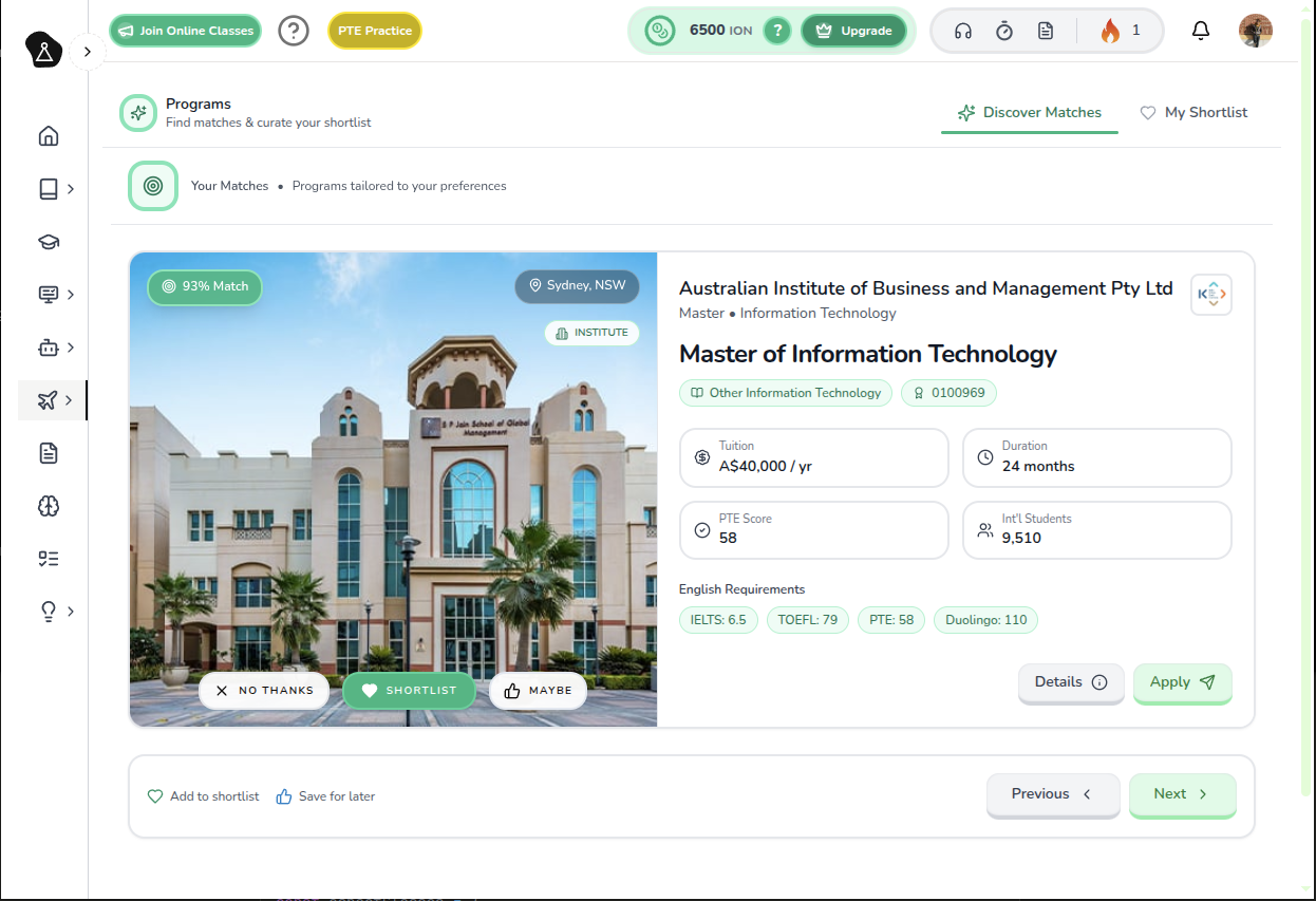 "Used the migration assistant to find programs that fit my budget. Then the SOP writer helped me draft my statement - my counselor edited it and we submitted. Got 68 in PTE which was exactly what Melbourne needed.found programs that fit my budget"