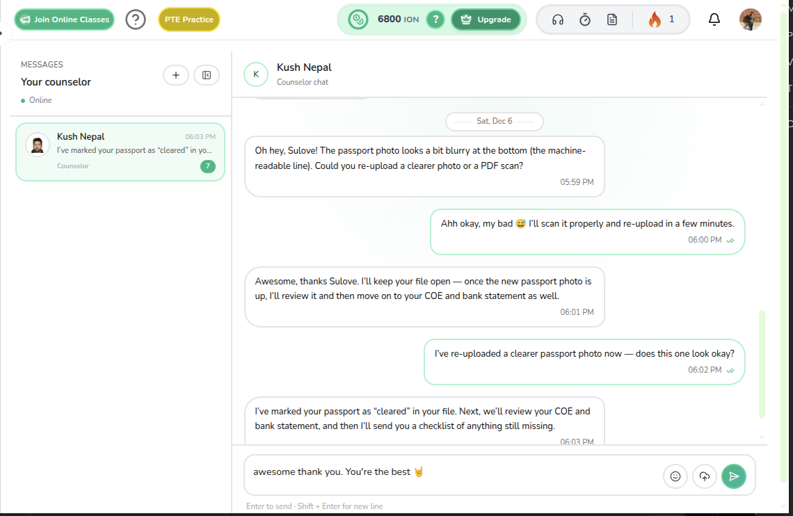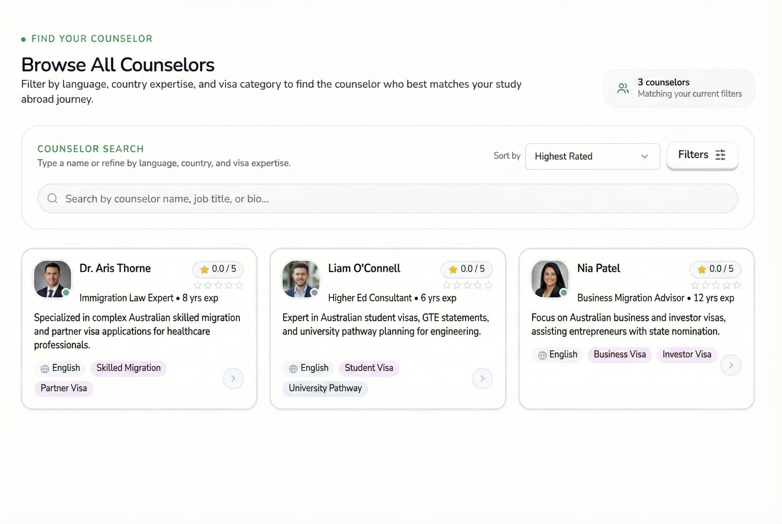 Expert teachers for coaching. Licensed agents for visas. AI tracking for applications. Direct counselor chat. Real professionals helping you succeed—not bots, not forums, actual experts who know the system.