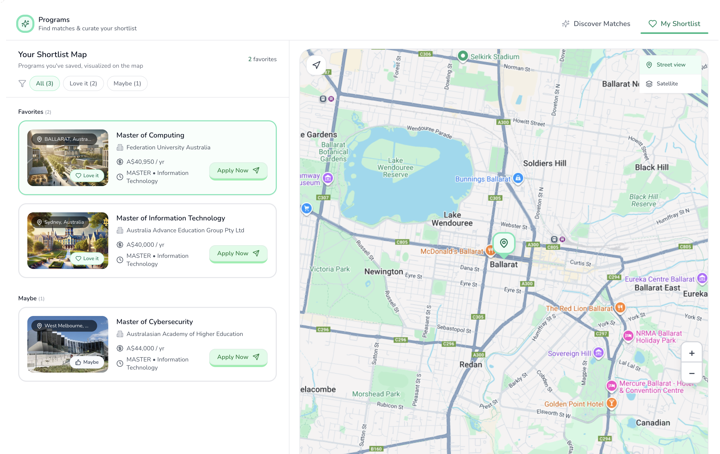 Search universities and colleges across USA, UK, Canada, Australia, New Zealand. AI matches your profile, grades, and budget to programs that actually fit. Compare and shortlist faster than any consultancy.